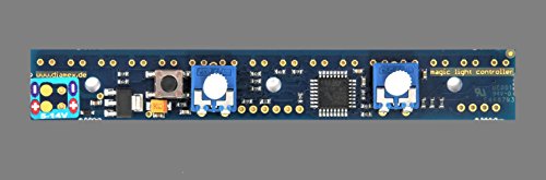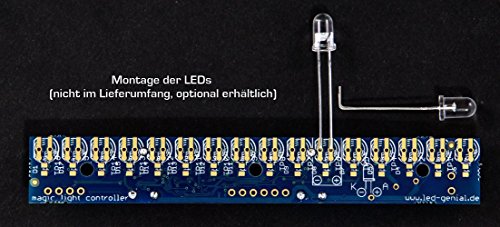 Technische gegevens: 16 lichtdiodes direct aansluitbaar, geen voorweerstanden vereist, looplicht-effecten vast geïntegreerd instellen van het gewenste effect via drukknop One-Shot functie met activering via knop of contact aansluitmogelijkheid voor externe knoppen of contacten (bijv. relais) looplichtrichtingswijziging via contact op de printplaat instelling van helderheid en snelheid via potis-besturing door microcontroller, stroomvoorziening 5 – 14 V Leveringsomvang: Magic-knipperplaat zonder gesoldeerde Lichtdiodes 2 steekassen voor potis, handleiding (mogelijk niet beschikbaar in het Nederlands) als download