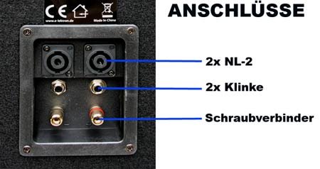 – Aansluitingen: 2x 6,3 mm jack bus / 2x NL2 luidsprekerbus / klemaansluiting